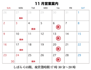 11月営業案内 毎週木曜日定休・月曜夜定休